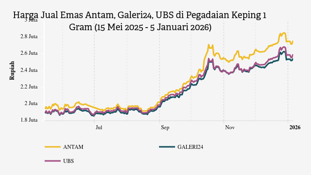 Sementara itu, emas produksi PT Untung Bersama Sejahtera (UBS) juga terpantau meroket. Untuk ukuran 1 gram, harga emas UBS melonjak signifikan sebesar Rp53.000 menjadi Rp2.612.000. Di sisi lain, emas Galeri24 yang merupakan produk besutan anak usaha Pegadaian sendiri, mengalami kenaikan sebesar Rp34.000, sehingga kini dipatok pada angka Rp2.556.000 per gram.