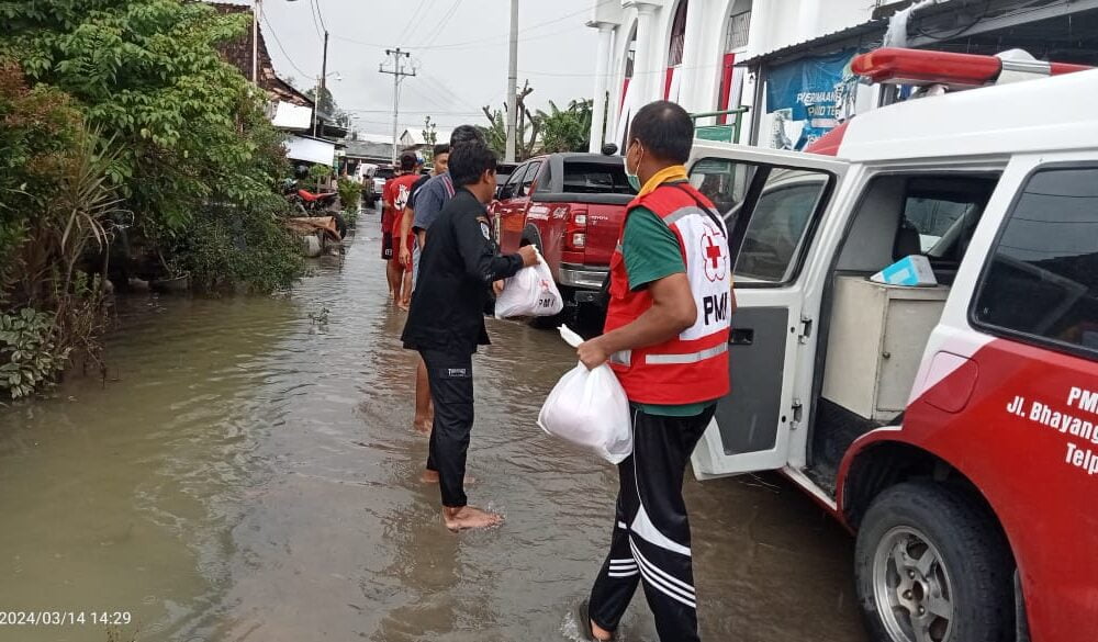 DEMAK- Ketinggian air di beberapa wilayah Kabupaten Demak masih tinggi, Palang Merah Indonesia (PMI) Kabupaten Demak distribusikan bantuan logistik berupa sembako, air bersih, karung sak, hygine...