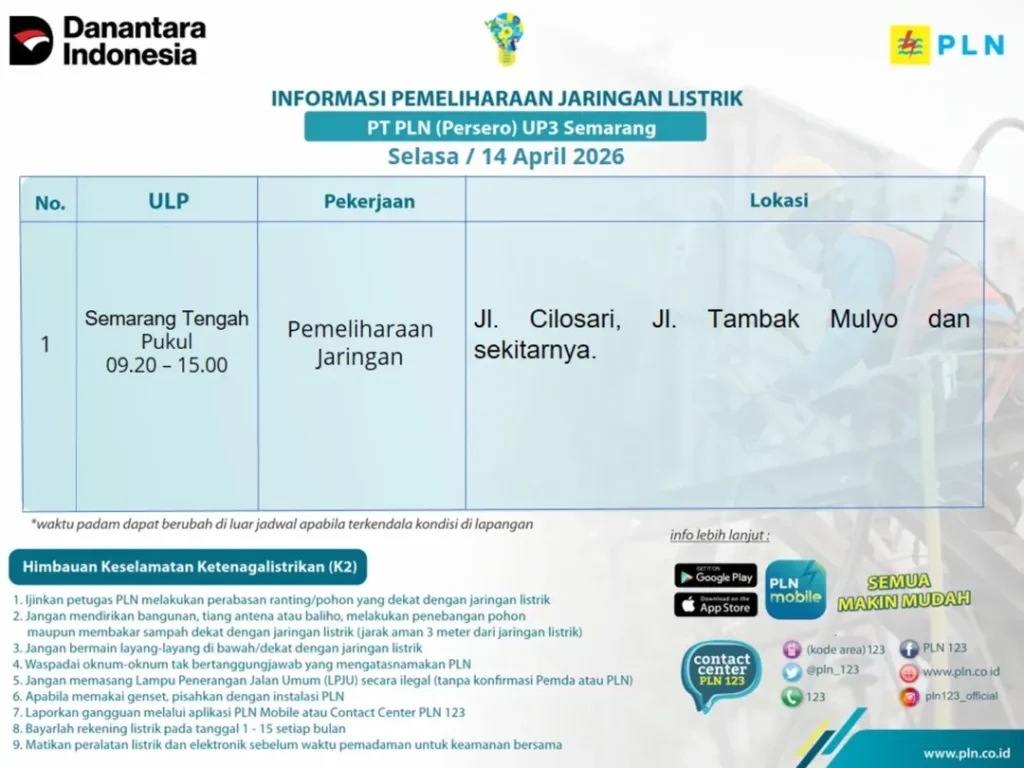 Semarang (usmnews)- Melalui pernyataan resmi dari akun Instagram, Pihak PLN menekankan pentingnya pemeliharaan jaringan secara berkala guna menjaga stabilitas pasokan listrik ke rumah warga. Langkah teknis ini menitikberatkan pada penguatan infrastruktur kelistrikan di wilayah pusat kota Semarang pada awal pekan ini. Info pemadaman listrik Semarang menyasar area Semarang Tengah untuk proses perbaikan kabel dan gardu distribusi utama. Jadwal info pemadaman listrik Semarang akan berlangsung mulai pukul 09.20 hingga 15.00 WIB sesuai rilis resmi. Petugas lapangan terus memantau kesiapan teknis karena info pemadaman listrik Semarang bertujuan meningkatkan keandalan layanan jangka panjang. Peristiwa info pemadaman listrik Semarang tetap menjadi perhatian utama bagi pelaku usaha dan warga di area terdampak.