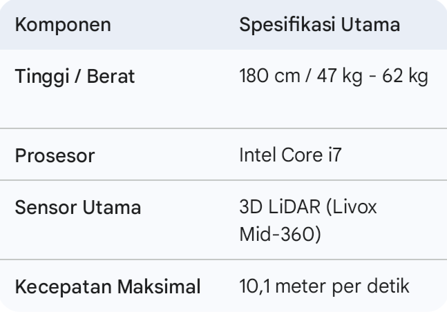 Untuk urusan navigasi, robot ini menggunakan sensor 3D LiDAR dan kamera kedalaman dengan cakupan persepsi hingga 360 derajat. Selain itu, prosesor Intel Core i7 menjadi otak utama yang mengolah seluruh data komputasi secara cepat. Keunggulan lainnya terletak pada baterai hot-swappable berkapasitas 864 Wh yang memudahkan penggantian daya tanpa mematikan sistem. Alhasil, peneliti dapat mengoperasikan robot ini selama 1,5 hingga 2 jam secara berkelanjutan.
